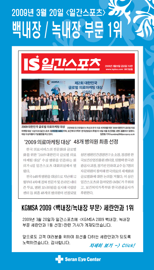 [일간스포츠]세란안과 백내장 1위 기사 게재 - 병원소식