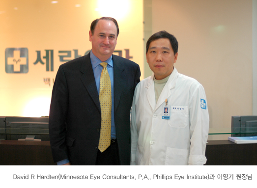 2005년 10월 7일 미국 웨이브프론트 라식(Wavefront Lasik)의 권위자 David R Hardten(Minnesota Eye Consultants P.A. Phillips Eye Institute)께서 저희 세란안과를 찾아 오셔서 최신 시력교정수술에 관한 논의를 하셨습니다. 앞으로 더욱 발전하는 세란안과가 되도록 노력하겠습니다.