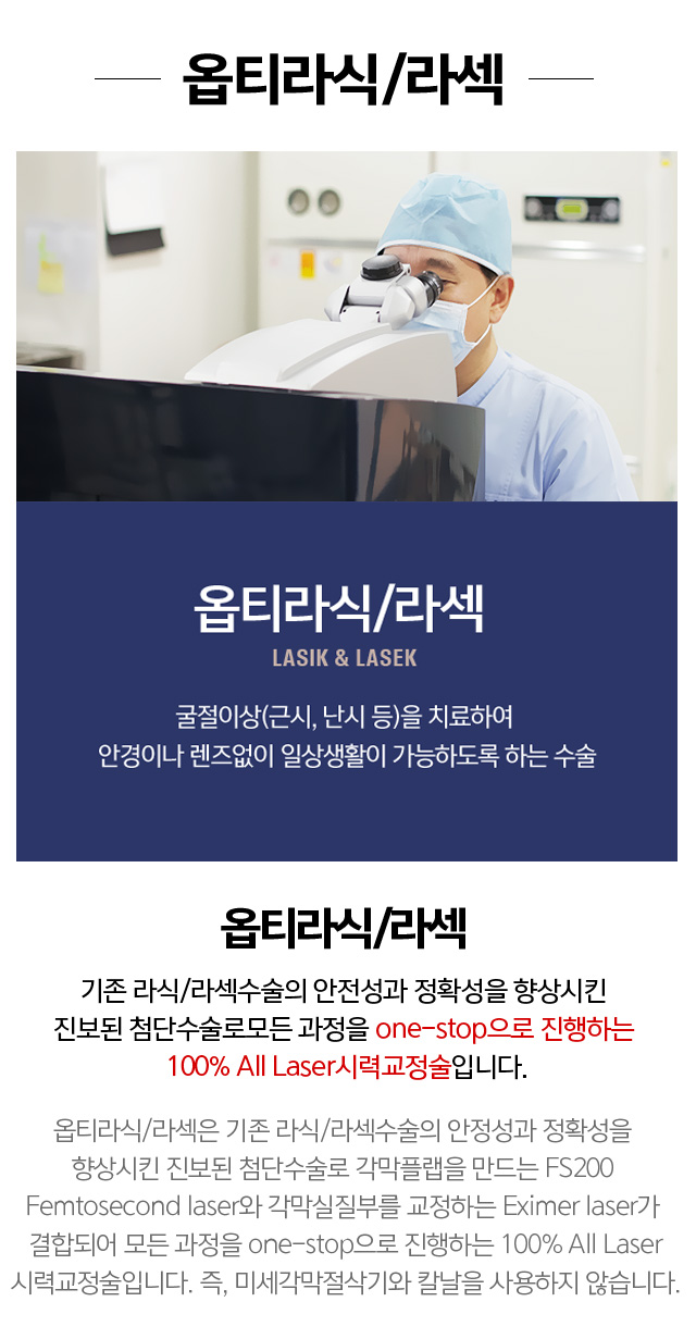 기존 라식/라섹수술의 안전성과 정확성을 향상시킨 진보된 첨단수술로 모든 과정을 one-stop으로 진행하는 100% All Laser시력교정술입니다.옵티라식/라섹은 기존 라식/라섹수술의 안정성과 정확성을 향상시킨 진보된 첨단수술로 각막플랩을 만드는 FS200 Femtosecond laser와 각막실질부를 교정하는 Eximer laser가 결합되어 모든 과정을 one-stop으로 진행하는 100% All Laser시력교정술입니다. 즉, 미세각막절삭기와 칼날을 사용하지 않습니다.