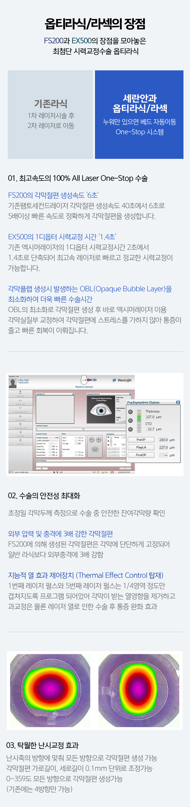 각막플랩 생성시 발생하는 OBL(Opaque Bubble Layer)을 최소화하여 더욱 빠른 수술시간OBL의 최소화로 각막절편 생성 후 바로 엑시머레이저 이용 각막실질부 교정하여 각막절편에 스트레스를 가하지 않아 통증이 줄고 빠른 회복이 이뤄집니다.